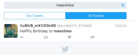 An easy search on Twitter (remember Twitter/Periscope are associated) – will find that there are no users that have the handle @Meexhiee. Using Twitter’s native search bar, you can see that the term “Meexhiee” was only used once in February 2013.