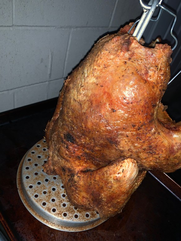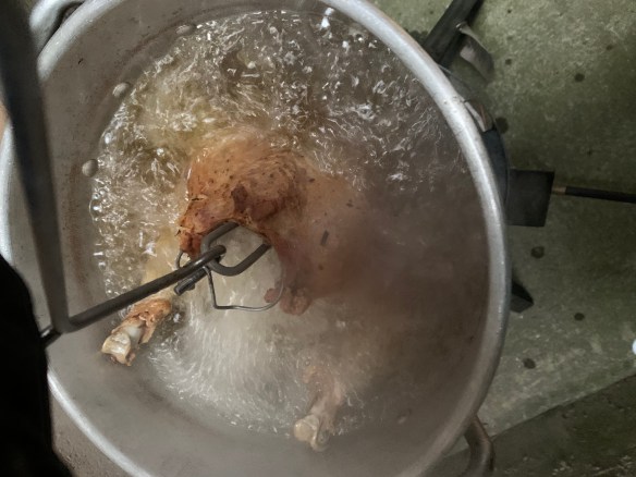 As I dunked the turkey in, I dropped it in very slowly. If you decide to make a three point dunk, your turkey will likely splash all the super hot peanut oil all over the place, and hot oil isn’t good for your Thanksgiving look.